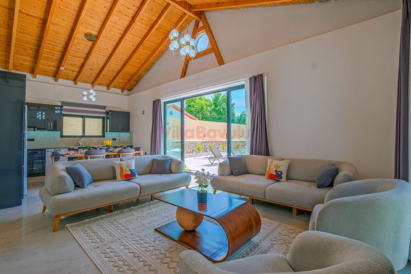 Doğa içinde, huzurlu bir konumu olan villanın havuz bahçe alanında kapasiteye uygun şezlong takımı, oturma grubu, barbekü alanı; havuz terasına açılan oturma odası, tam donanımlı açık mutfağı bulunmaktadır. Üç yatak odasında çift kişilik yatak ve ebeveyn banyosu ; dördüncü yatak odasında ise  çift kişilik yatak  bulunmaktadır.