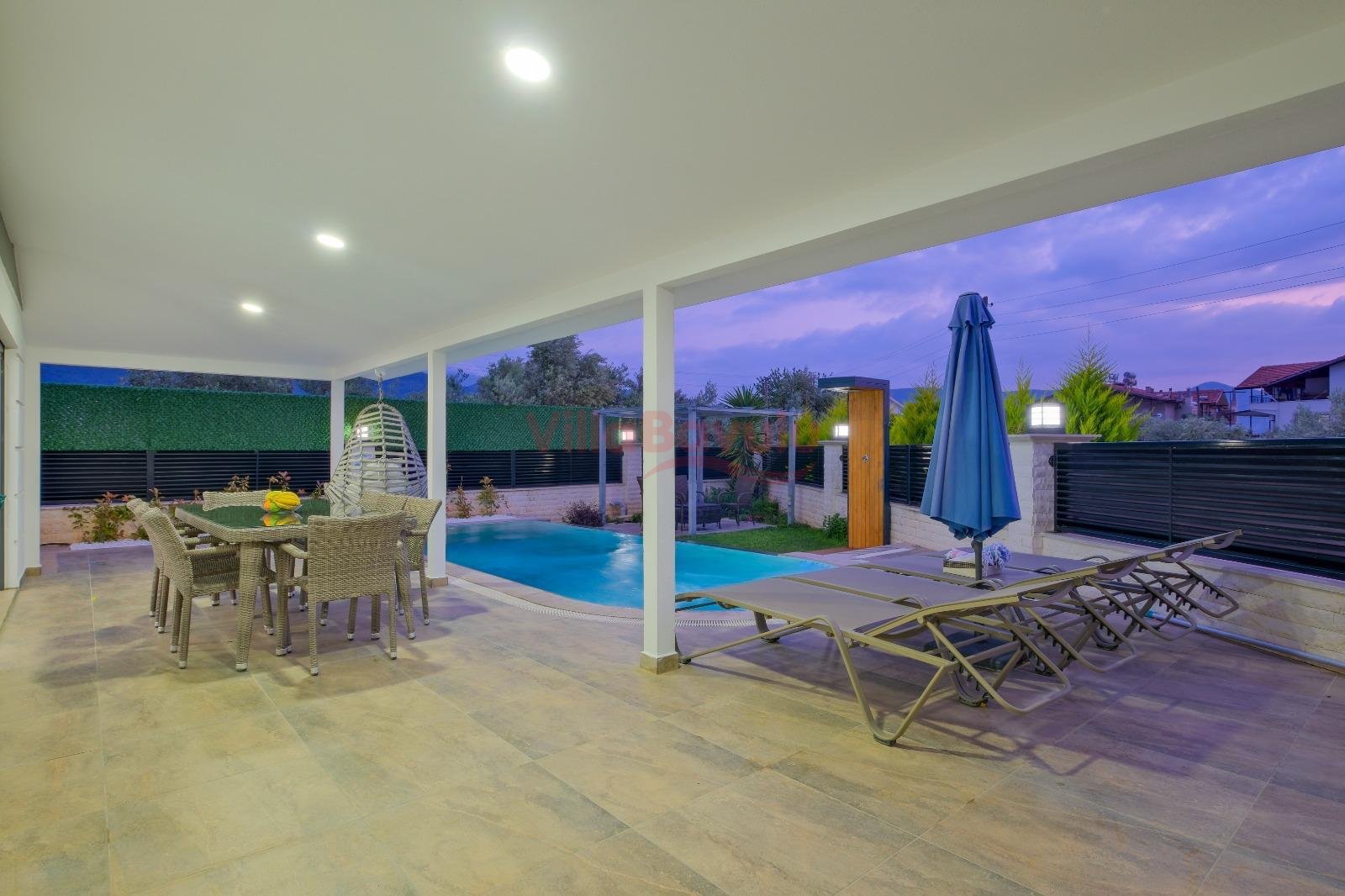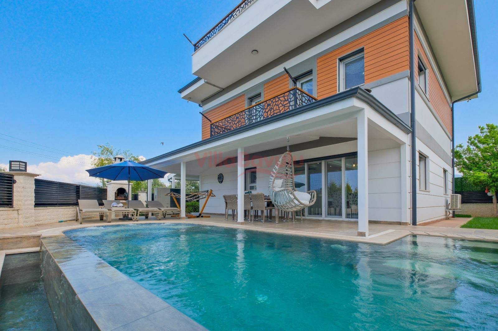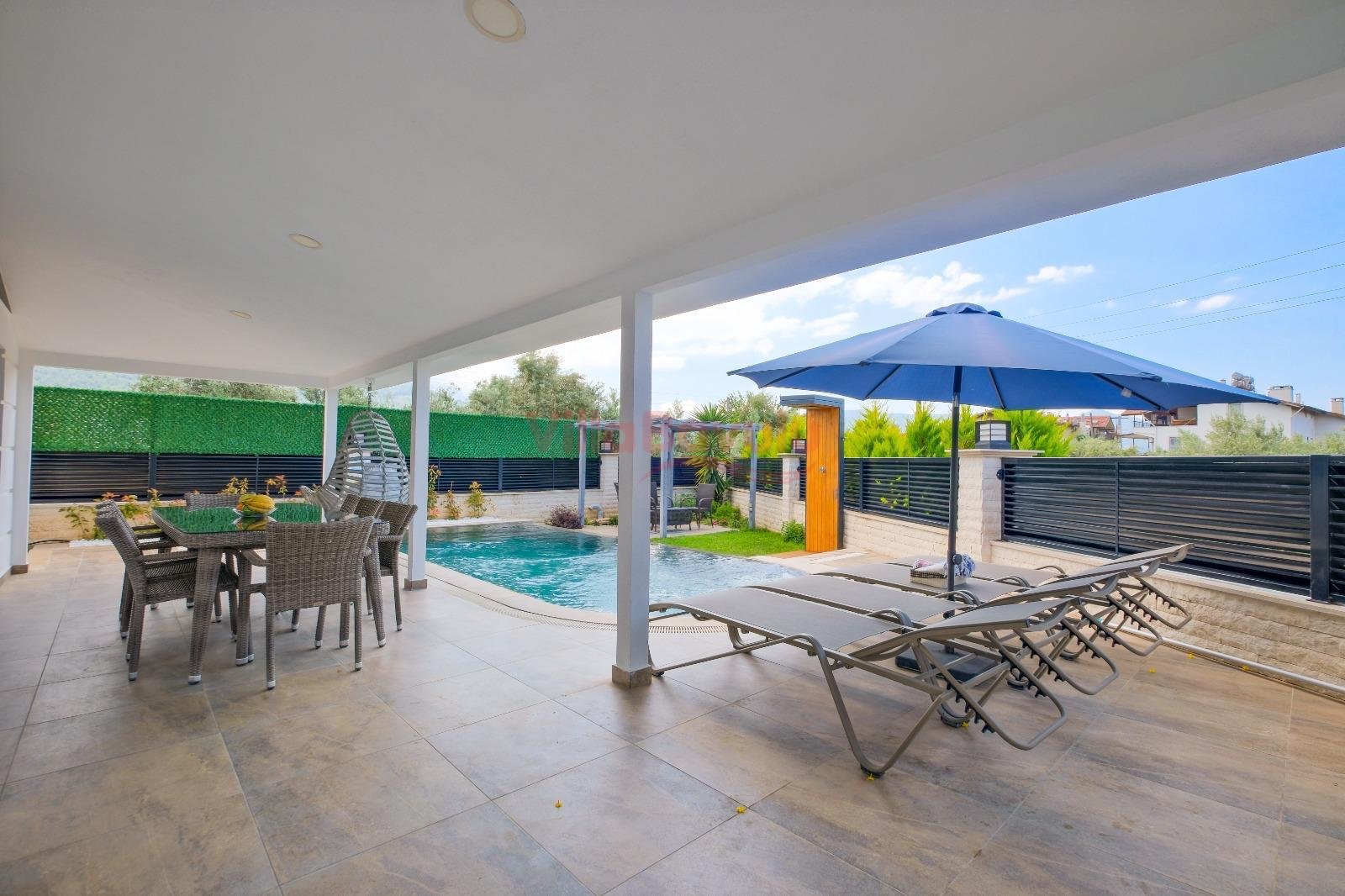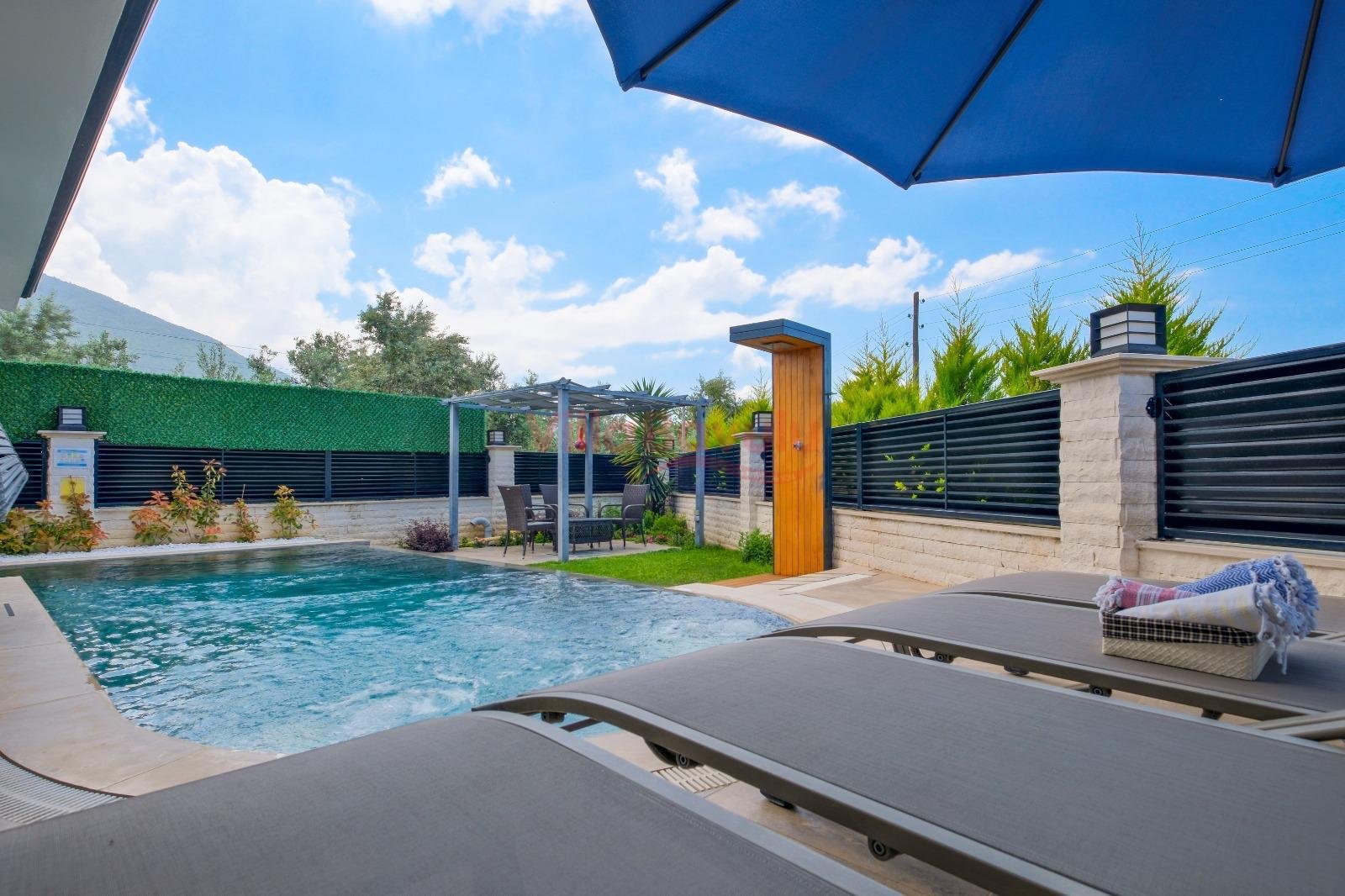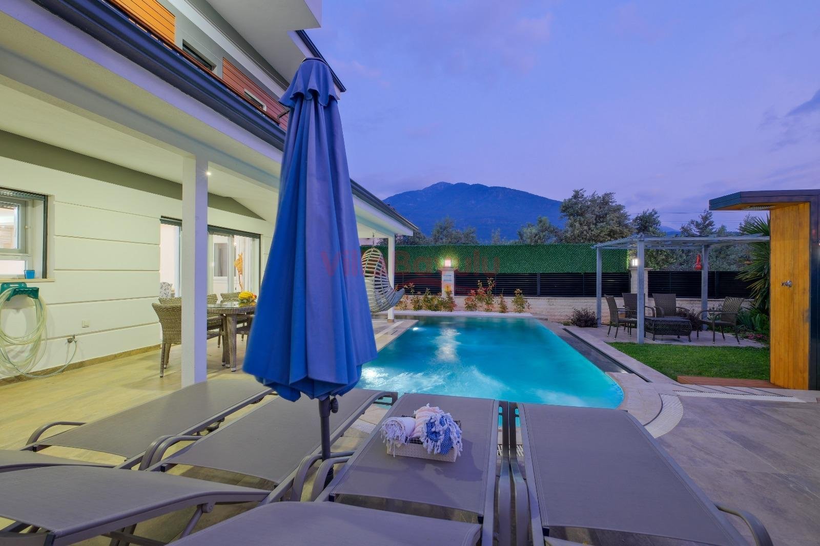 Geniş bahçesiyle çocuklu aileler için oldukça uygun olan villa, sizlere Fethiye merkeze, turizm noktalarına ve denize yakın bir konumunda, mola vaadetmektedir. İhtiyaçlarınız düşünülerek dizayn edilmiş bahçe alanı geniş havuz terasına sahip ve kullanışlı havuz bulunmaktadır. Havuz bahçe alanında kapasiteye uygun şezlong takımı, oturma grubu ve barbekü bulunmaktadır. Konforunuz gözetilerek tasarlanmış olan havuz alanına açılan ferah oturma odası, tam donanımlı açık mutfak; dört yatak odasında çift kişilik yatak; diğer iki yatak odasında da tek kişilik iki adet yatak bulunmaktadır. Villa, ihtiyaçlarınıza karşılık verecek donanıma sahiptir.