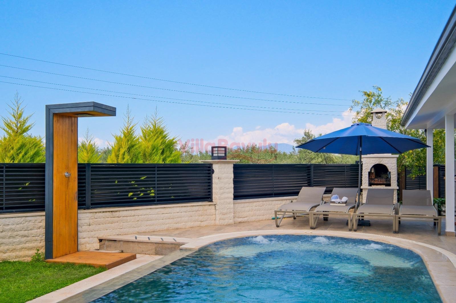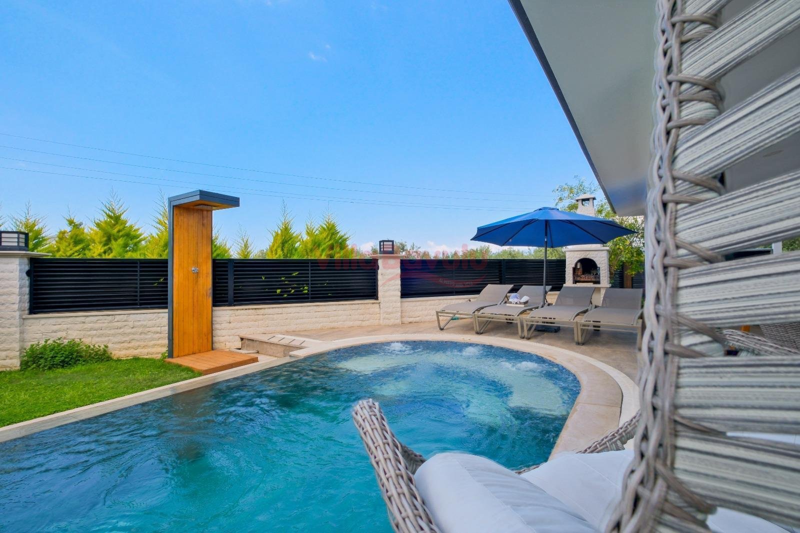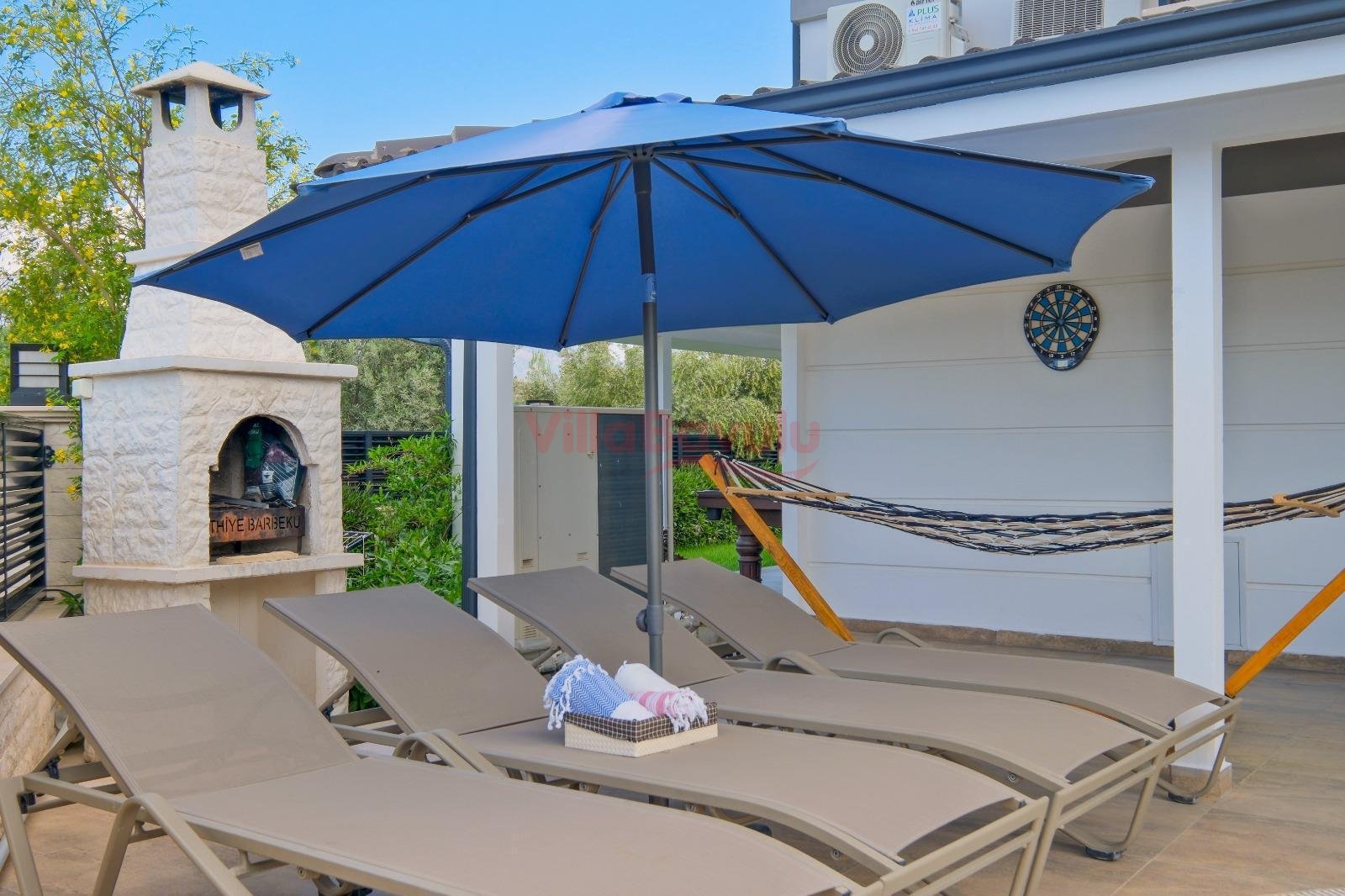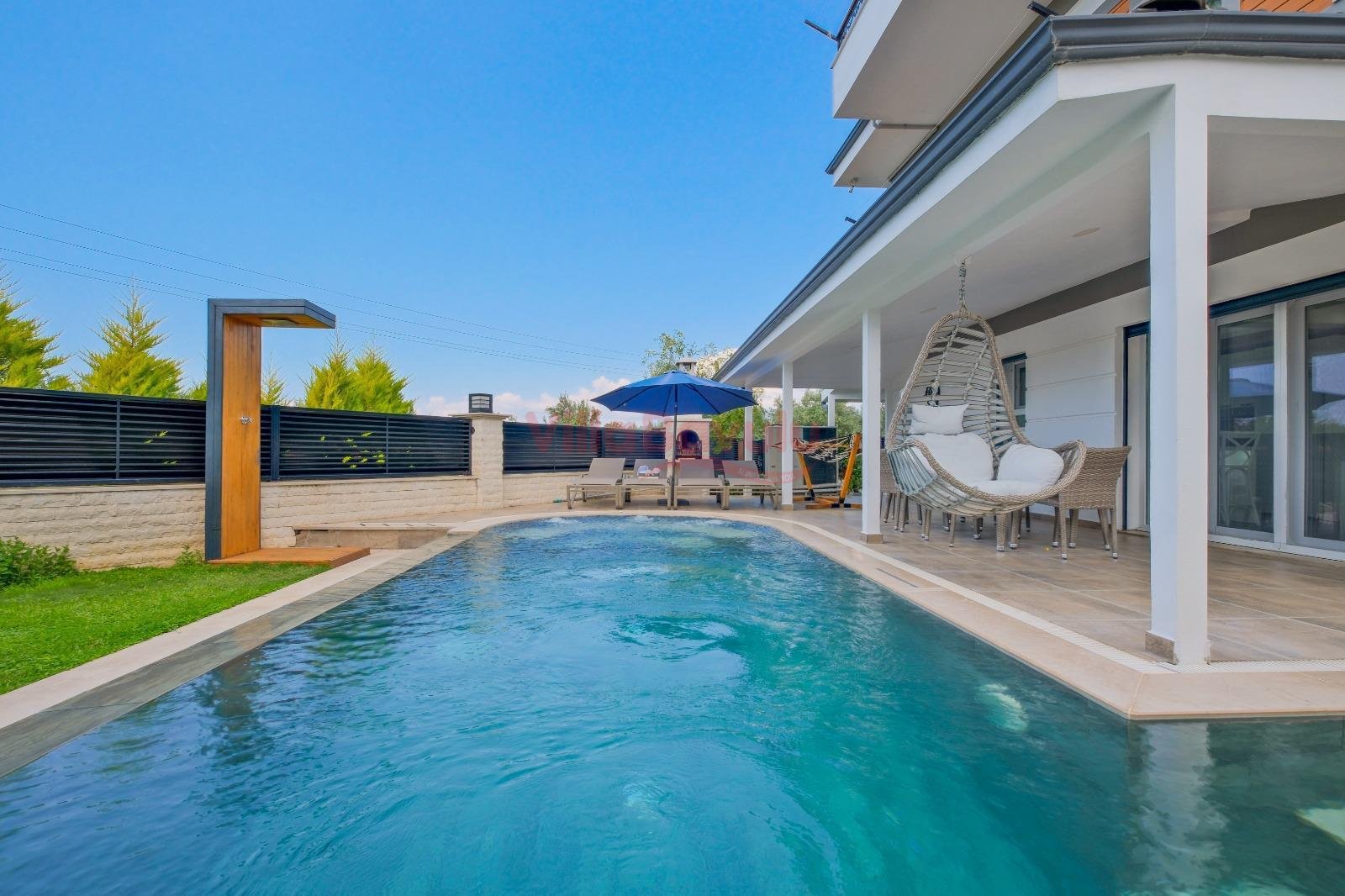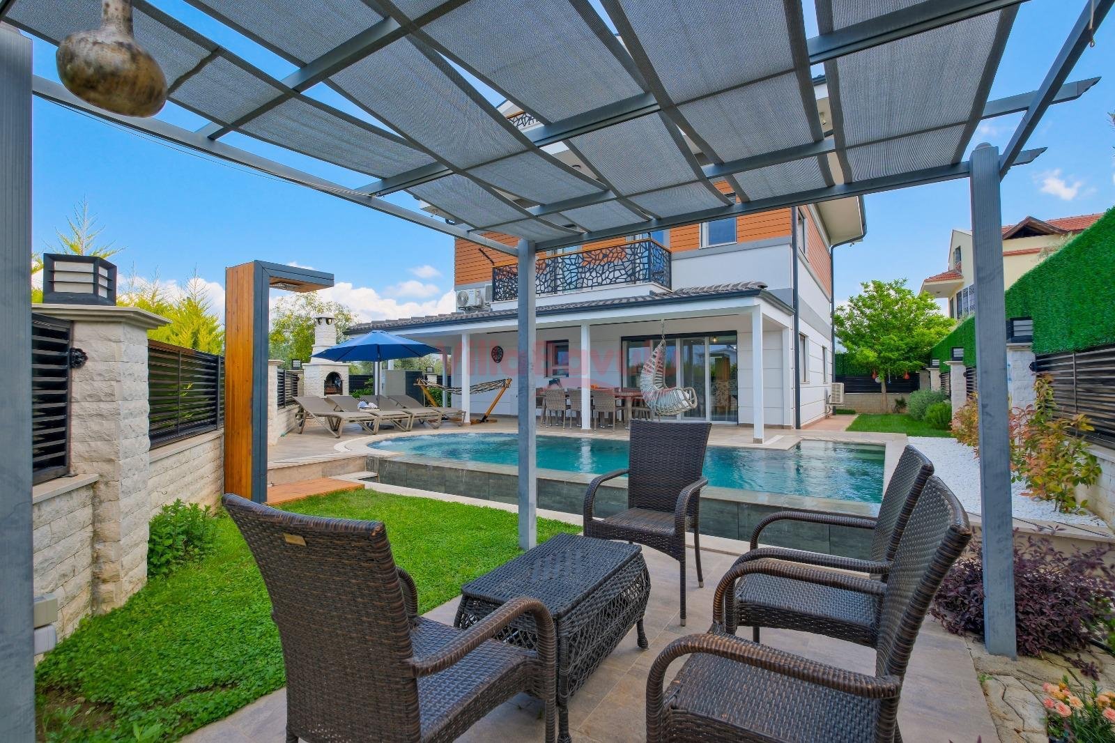 Geniş bahçesiyle çocuklu aileler için oldukça uygun olan villa, sizlere Fethiye merkeze, turizm noktalarına ve denize yakın bir konumunda, mola vaadetmektedir. İhtiyaçlarınız düşünülerek dizayn edilmiş bahçe alanı geniş havuz terasına sahip ve kullanışlı havuz bulunmaktadır. Havuz bahçe alanında kapasiteye uygun şezlong takımı, oturma grubu ve barbekü bulunmaktadır. Konforunuz gözetilerek tasarlanmış olan havuz alanına açılan ferah oturma odası, tam donanımlı açık mutfak; dört yatak odasında çift kişilik yatak; diğer iki yatak odasında da tek kişilik iki adet yatak bulunmaktadır. Villa, ihtiyaçlarınıza karşılık verecek donanıma sahiptir.