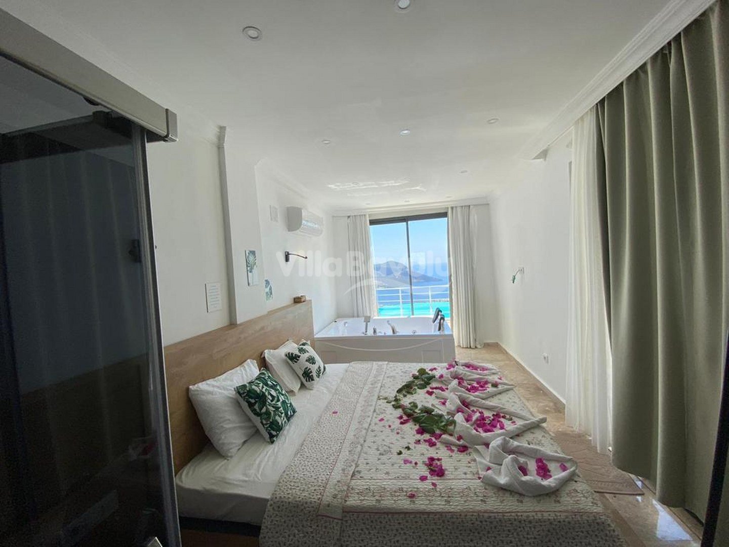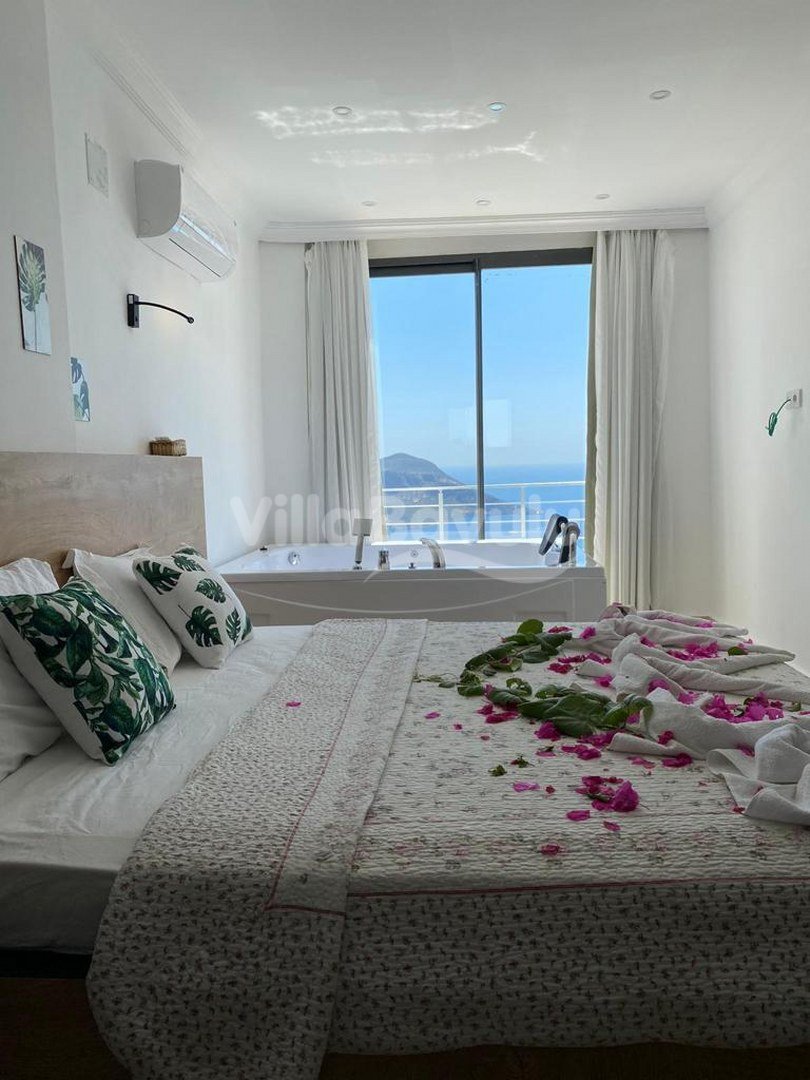 Muhteşem deniz manzarasından havuz terasına açılan görkemli alan da kapasiteye uygun şezlong takımı, oturma grubu, barbekü; salıncak, çocuk oyun alanı bulunan villanın iç mekanında ihtiyaçlarınıza karşılık verecek konforlu oturma odası, tam donanımlı açık mutfağı; Birinci yatak odasında çift kişilik yatak ve ebeveyn banyosu ve jakuzi; ikinci yatak odasında ise tek kişilik iki adet yatak bulunmaktadır.