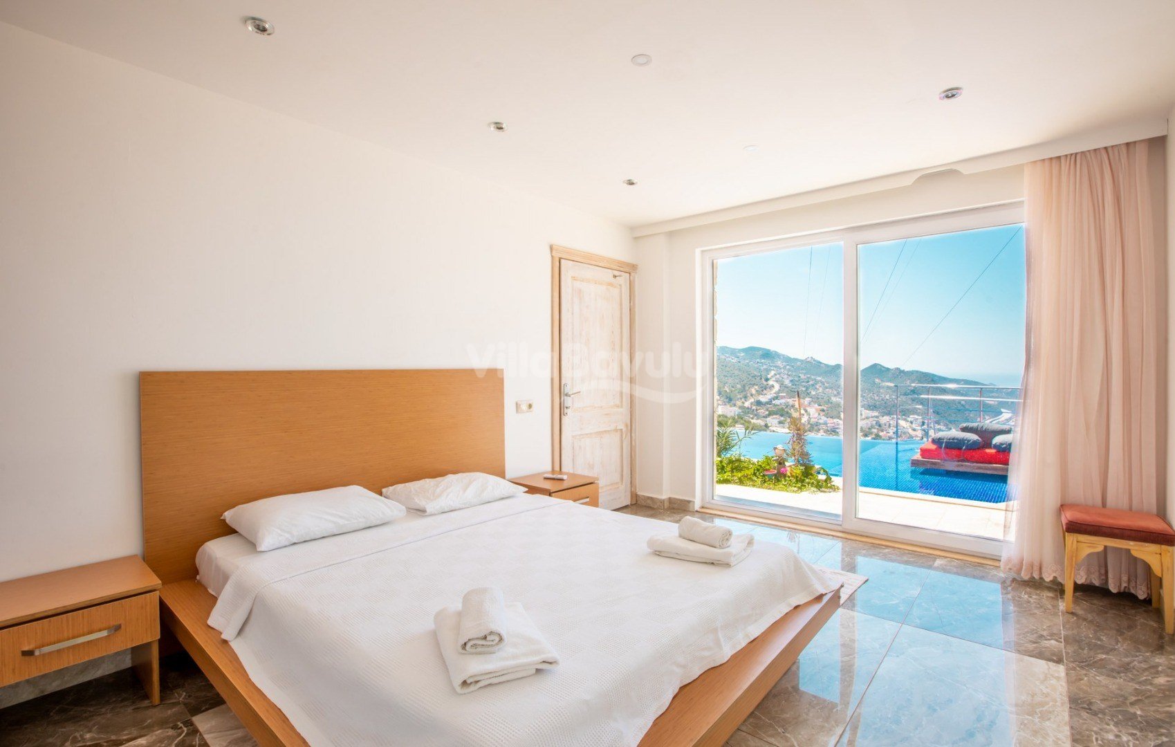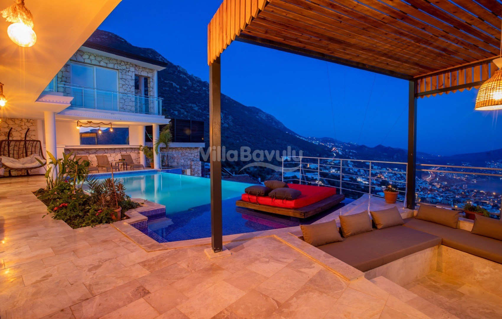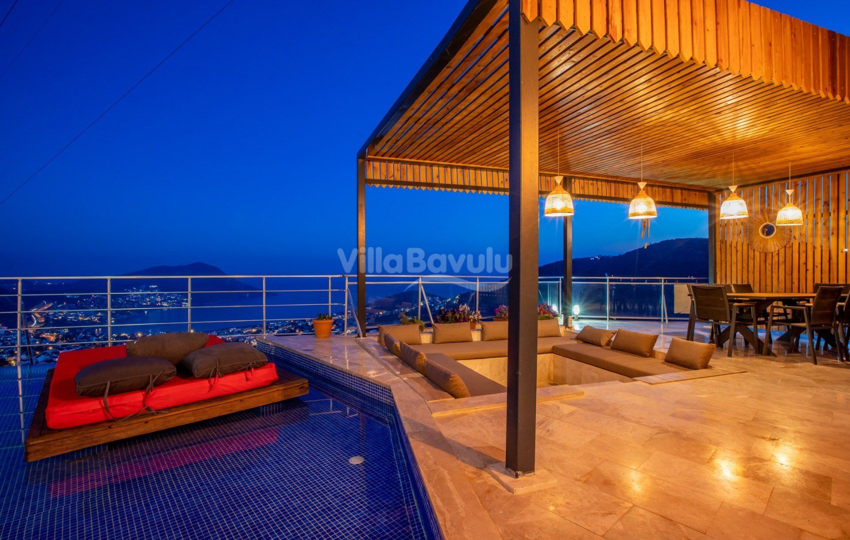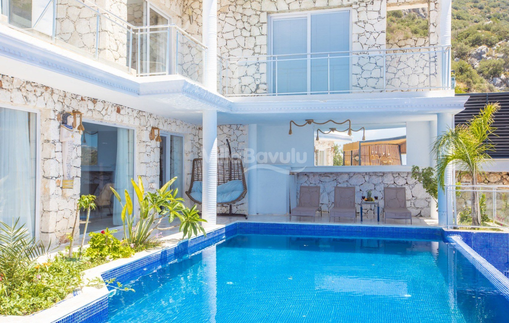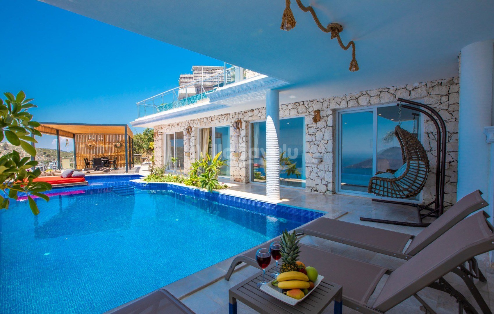 Muhteşem deniz manzarasından havuz terasına açılan görkemli alan da kapasiteye uygun şezlong takımı, oturma grubu, barbekü; salıncak, çocuk oyun alanı bulunan villanın iç mekanında ihtiyaçlarınıza karşılık verecek konforlu oturma odası, tam donanımlı açık mutfağı; Birinci ve ikinci yatak odasında çift kişilik yatak ve ebeveyn banyosu; üçüncü ve dördüncü yatak odasında ise iki adet tek kişilik yatak bulunmaktadır.