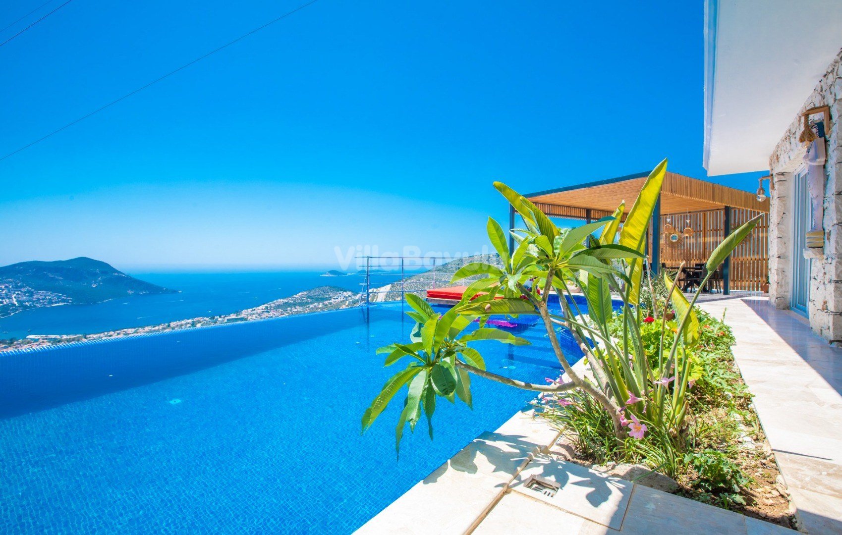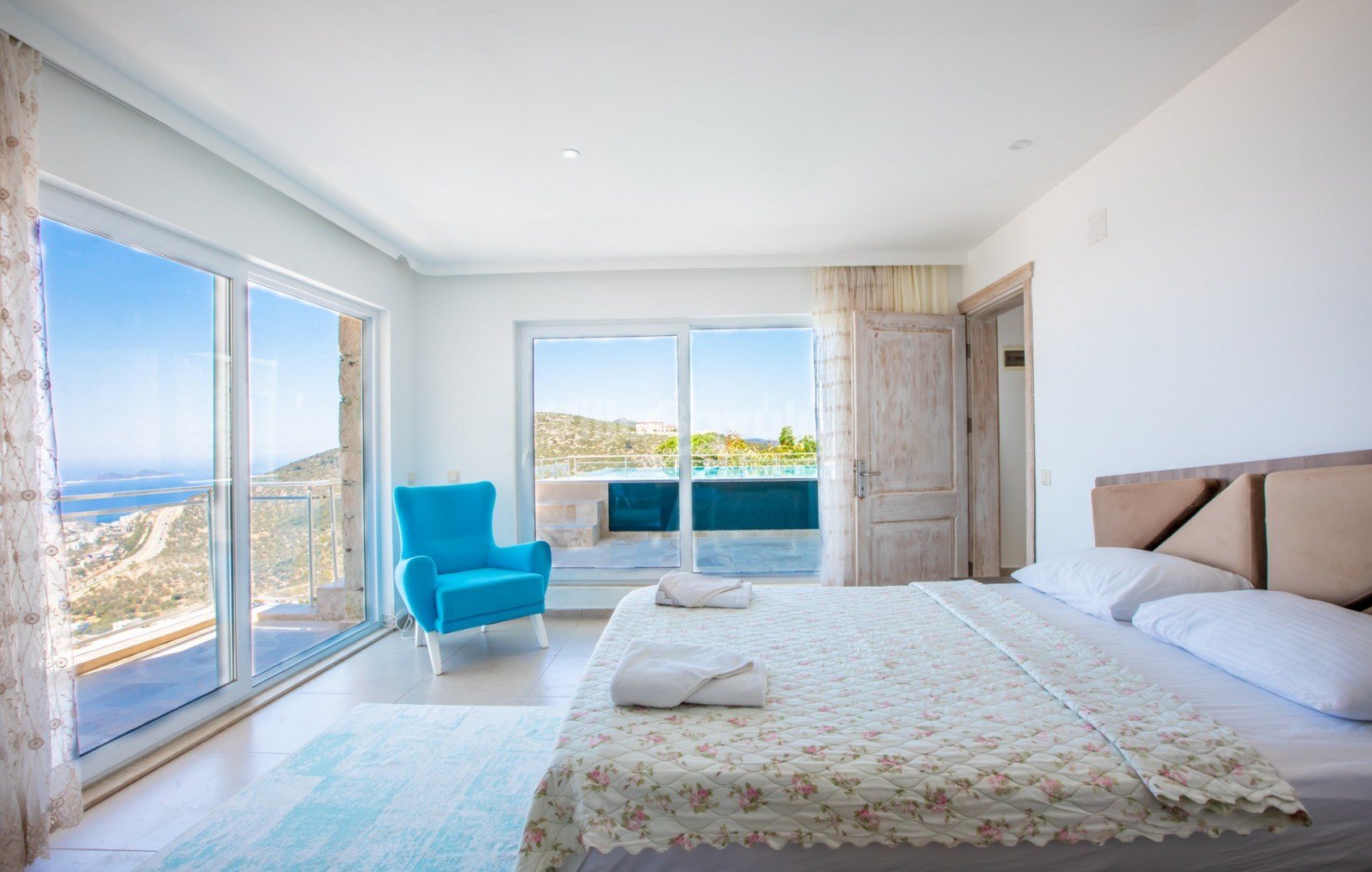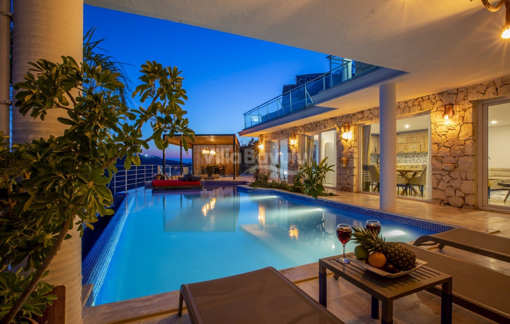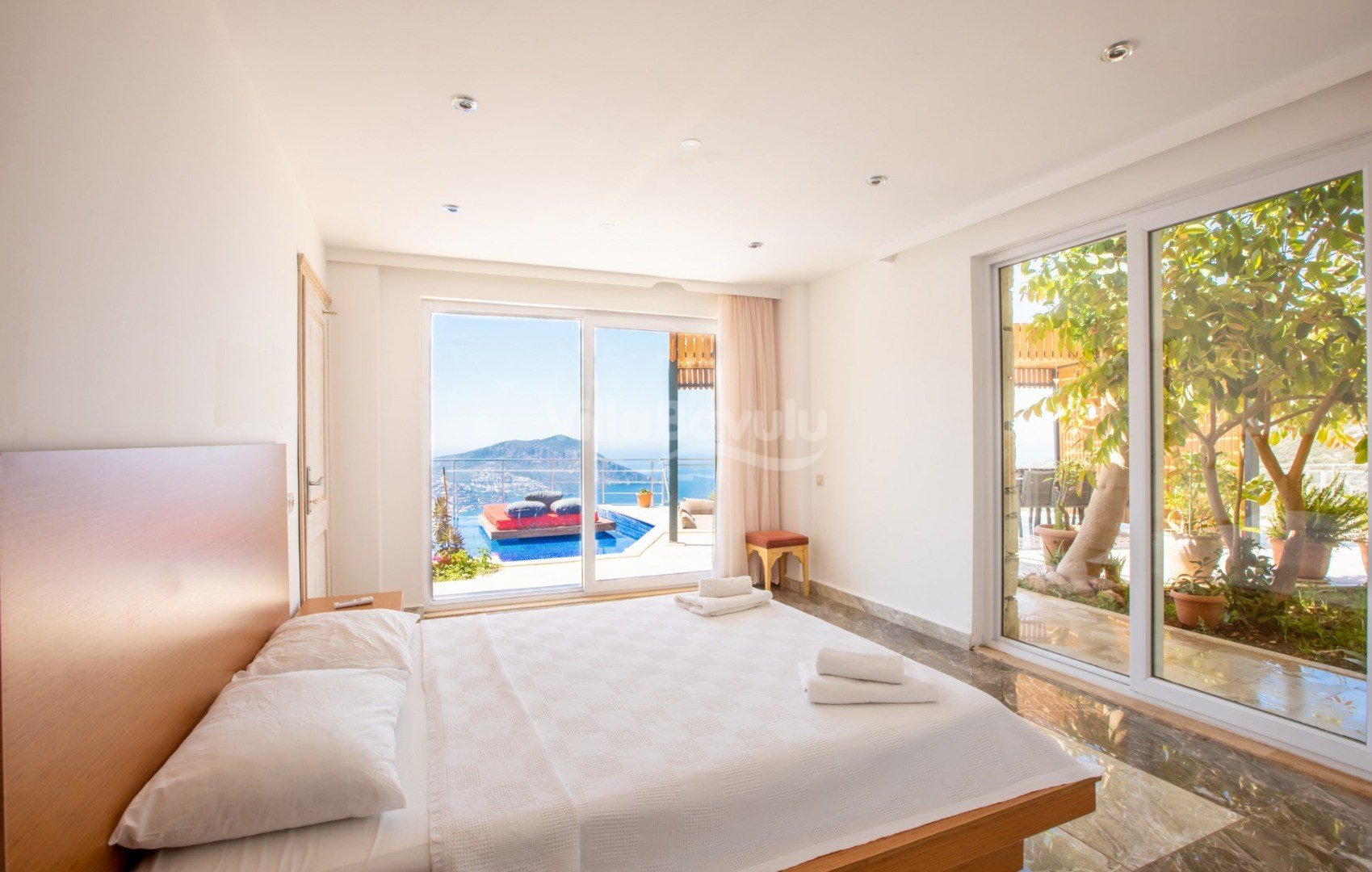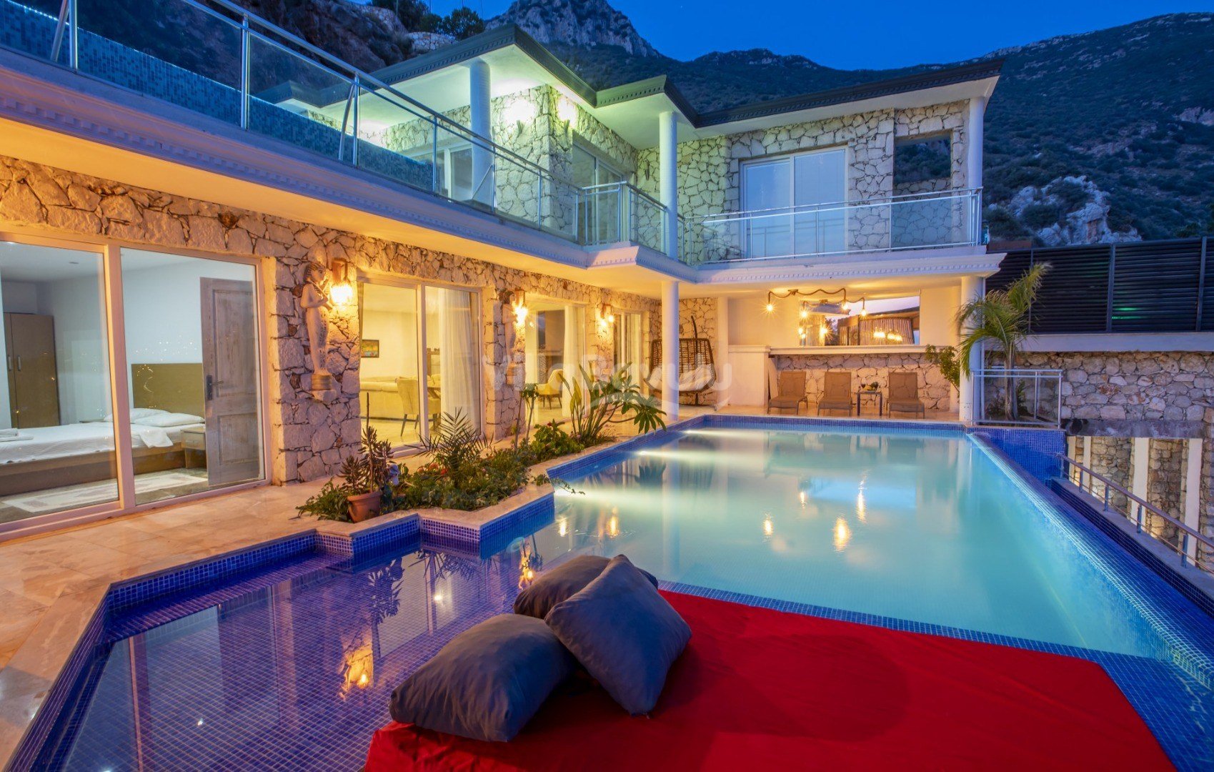 Muhteşem deniz manzarasından havuz terasına açılan görkemli alan da kapasiteye uygun şezlong takımı, oturma grubu, barbekü; salıncak, çocuk oyun alanı bulunan villanın iç mekanında ihtiyaçlarınıza karşılık verecek konforlu oturma odası, tam donanımlı açık mutfağı; Birinci ve ikinci yatak odasında çift kişilik yatak ve ebeveyn banyosu; üçüncü ve dördüncü yatak odasında ise iki adet tek kişilik yatak bulunmaktadır.