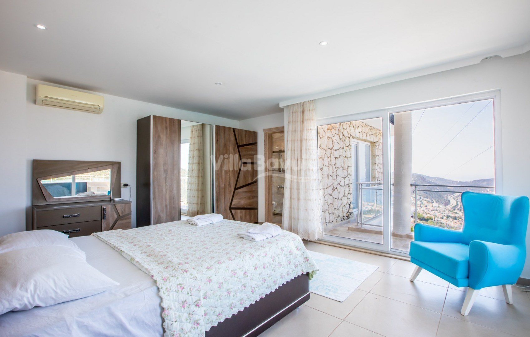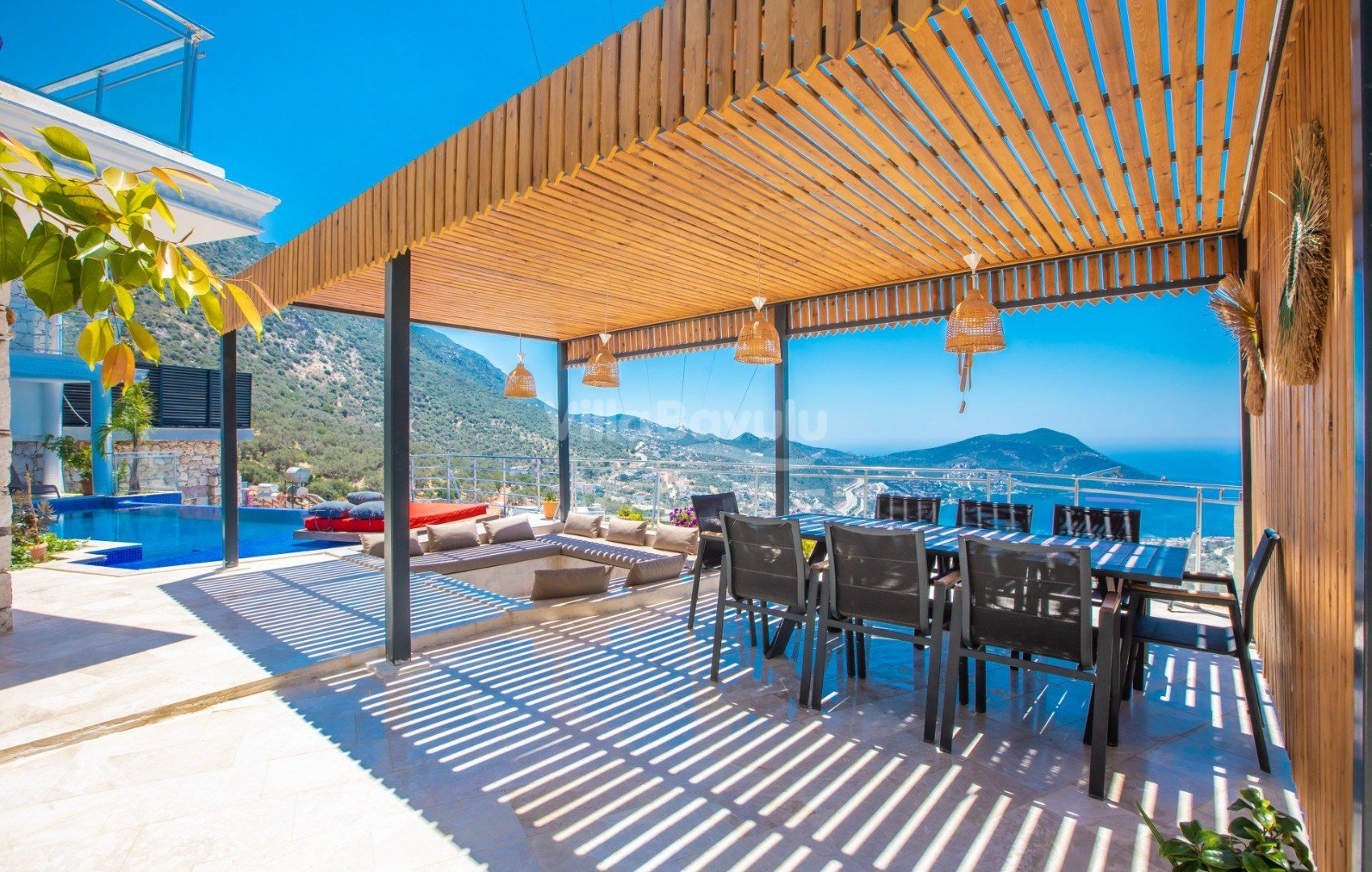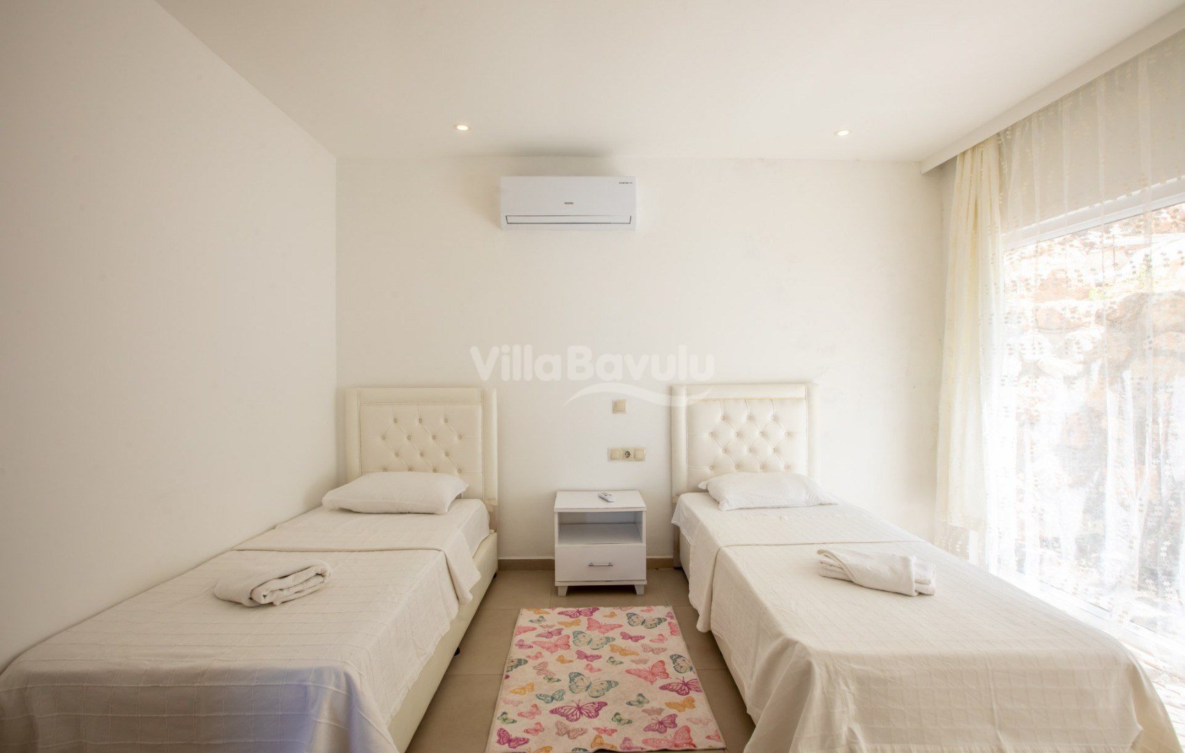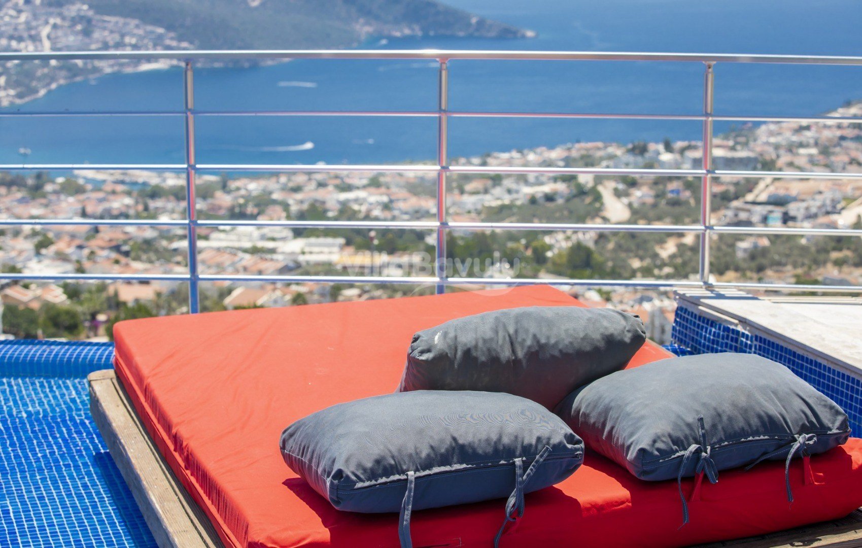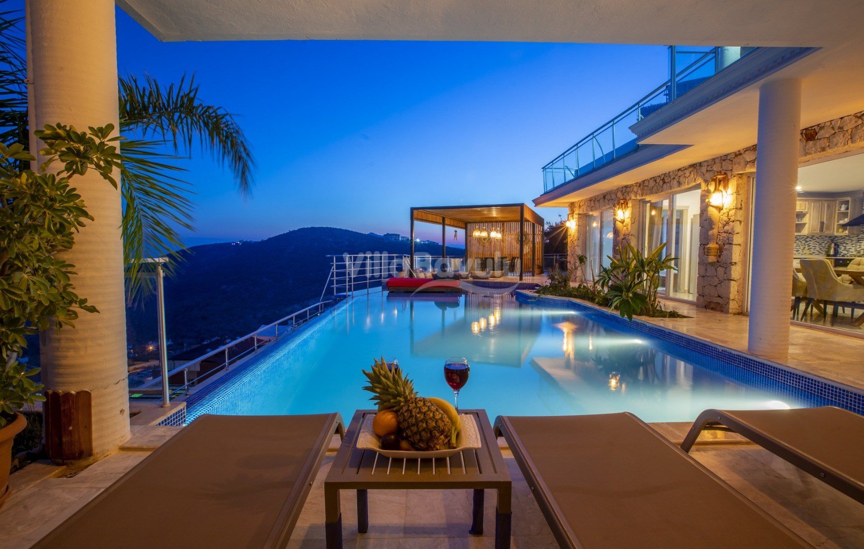 Muhteşem deniz manzarasından havuz terasına açılan görkemli alan da kapasiteye uygun şezlong takımı, oturma grubu, barbekü; salıncak, çocuk oyun alanı bulunan villanın iç mekanında ihtiyaçlarınıza karşılık verecek konforlu oturma odası, tam donanımlı açık mutfağı; Birinci ve ikinci yatak odasında çift kişilik yatak ve ebeveyn banyosu; üçüncü ve dördüncü yatak odasında ise iki adet tek kişilik yatak bulunmaktadır.