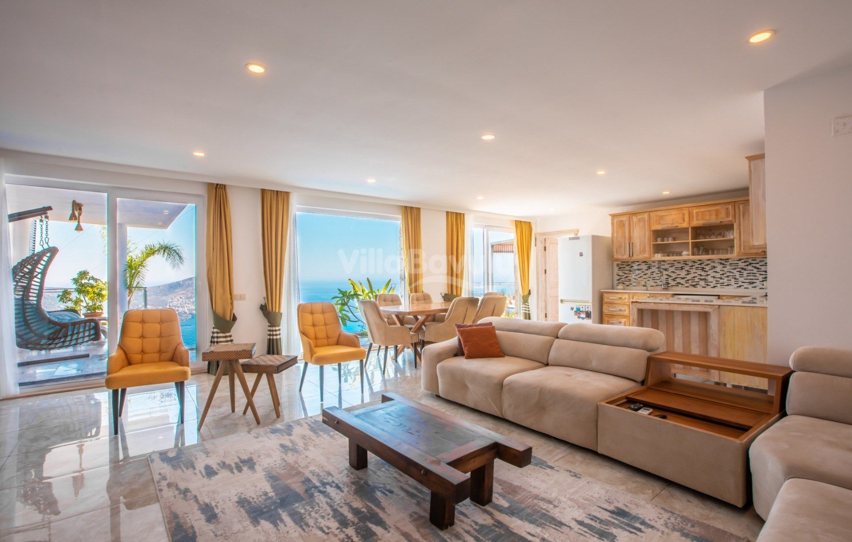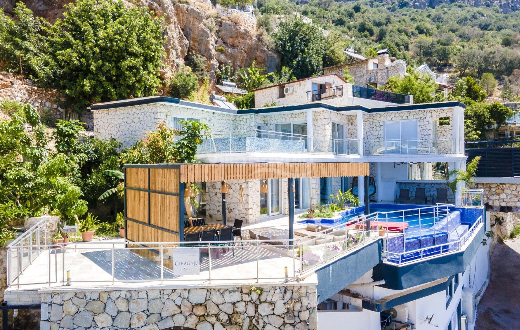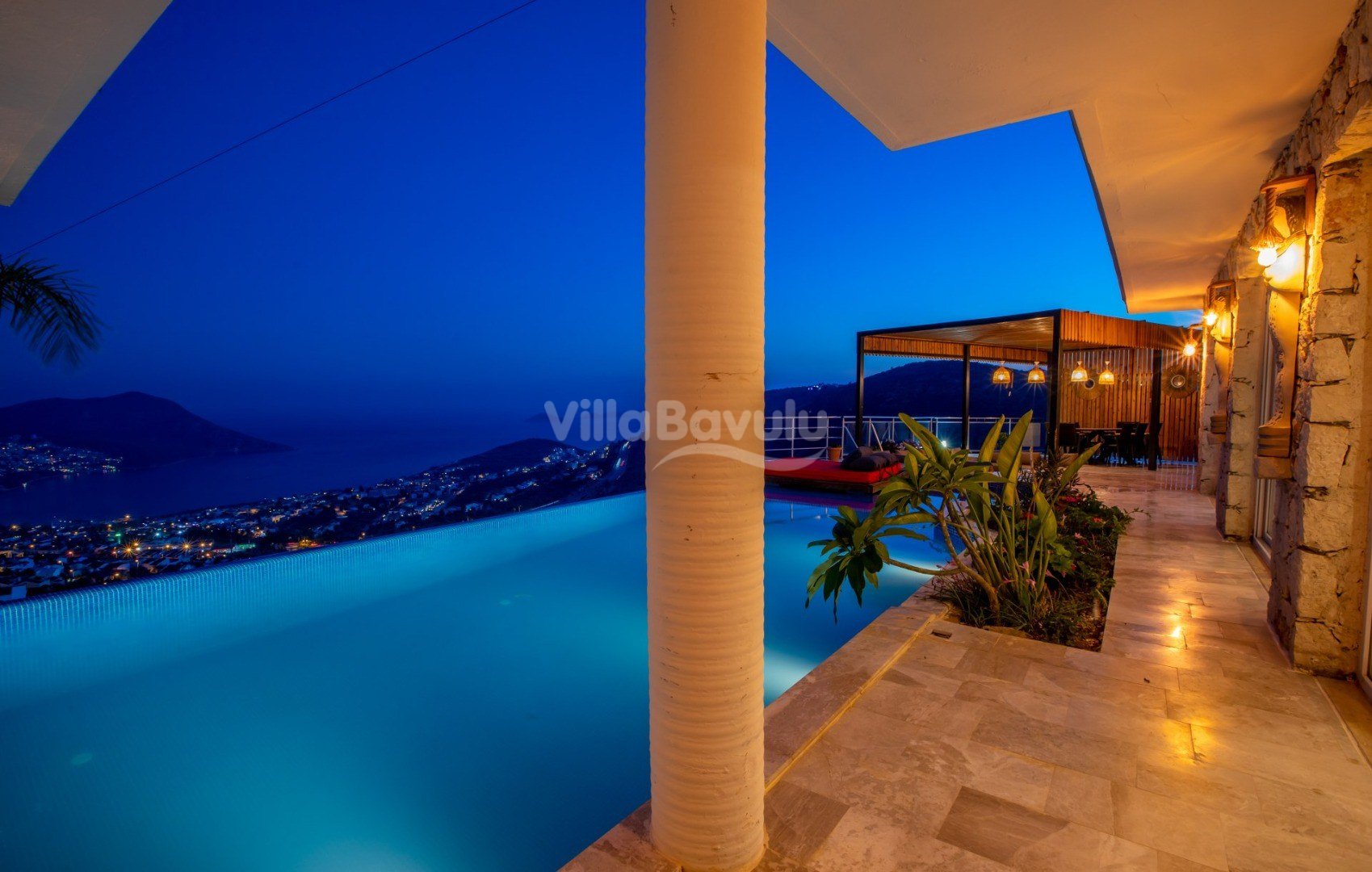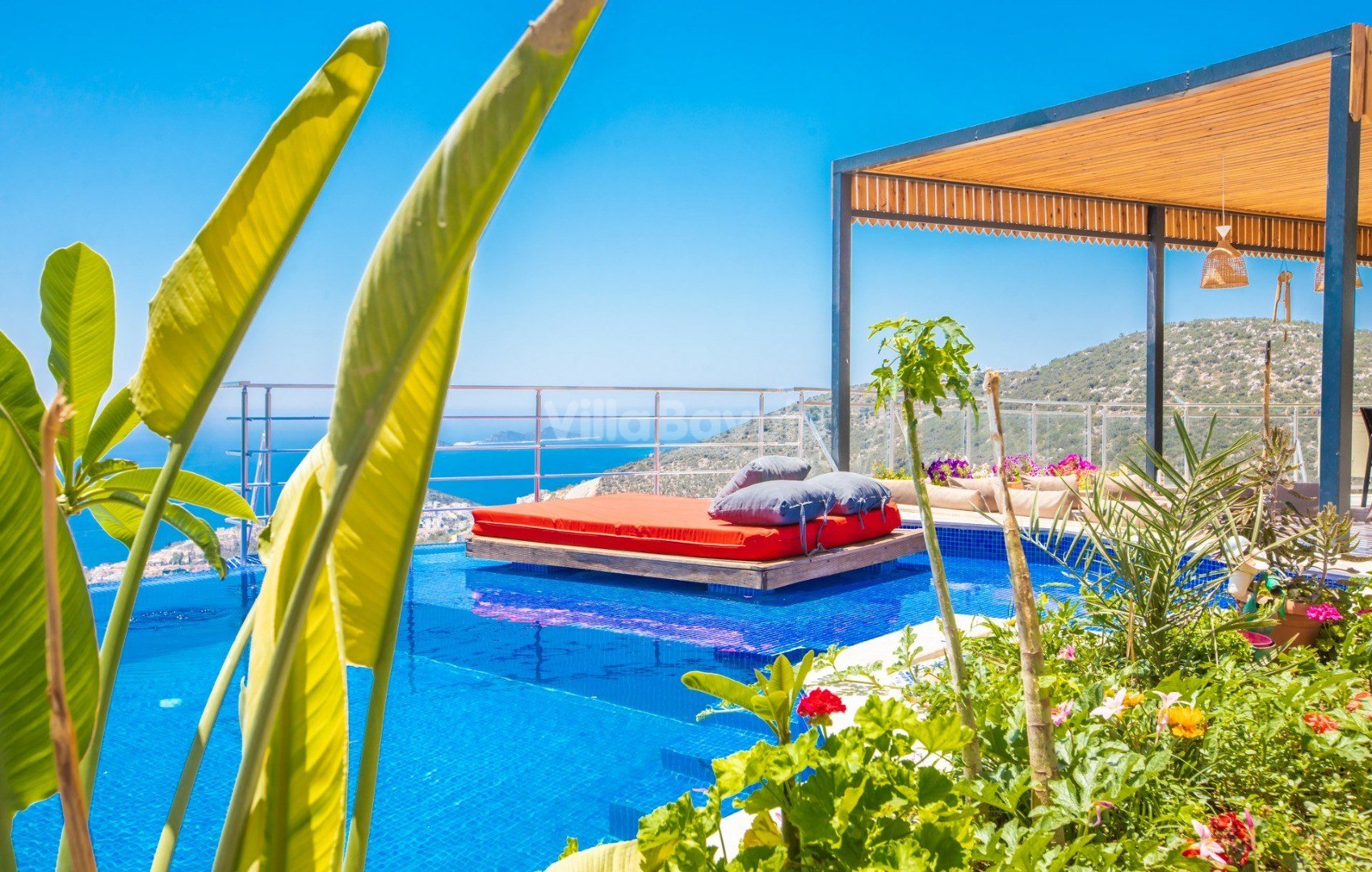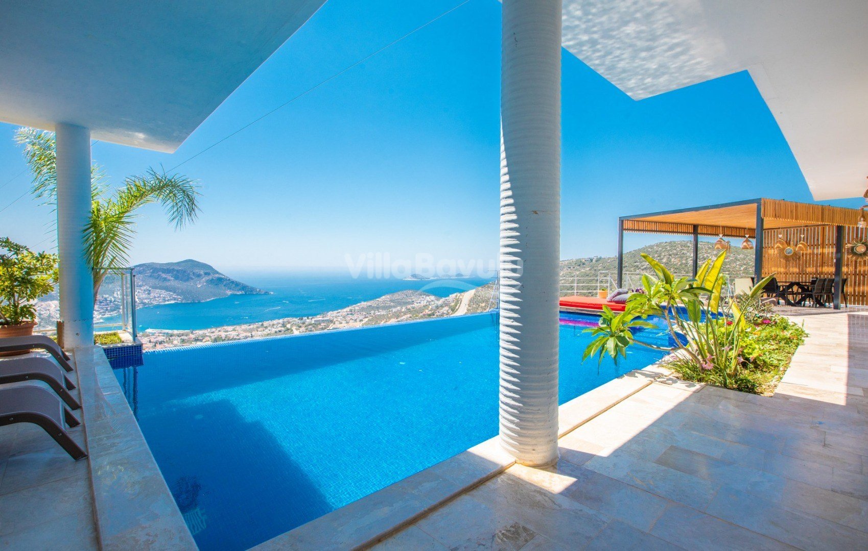 Muhteşem deniz manzarasından havuz terasına açılan görkemli alan da kapasiteye uygun şezlong takımı, oturma grubu, barbekü; salıncak, çocuk oyun alanı bulunan villanın iç mekanında ihtiyaçlarınıza karşılık verecek konforlu oturma odası, tam donanımlı açık mutfağı; Birinci ve ikinci yatak odasında çift kişilik yatak ve ebeveyn banyosu; üçüncü ve dördüncü yatak odasında ise iki adet tek kişilik yatak bulunmaktadır.