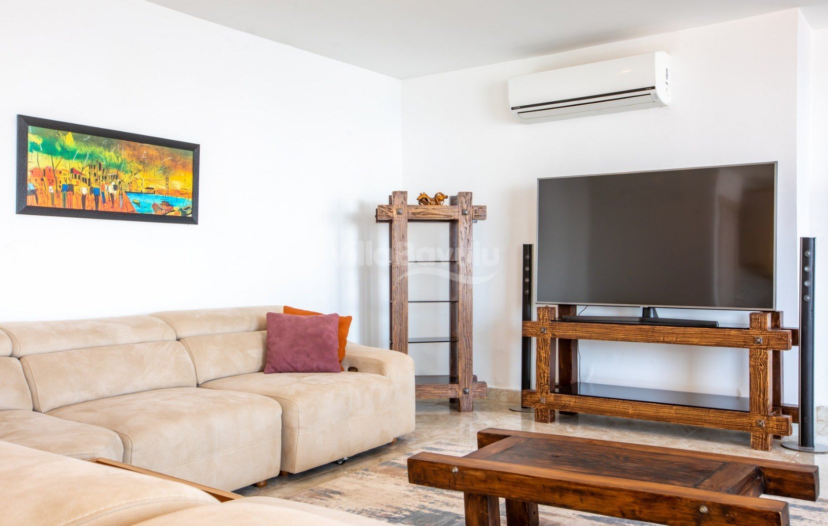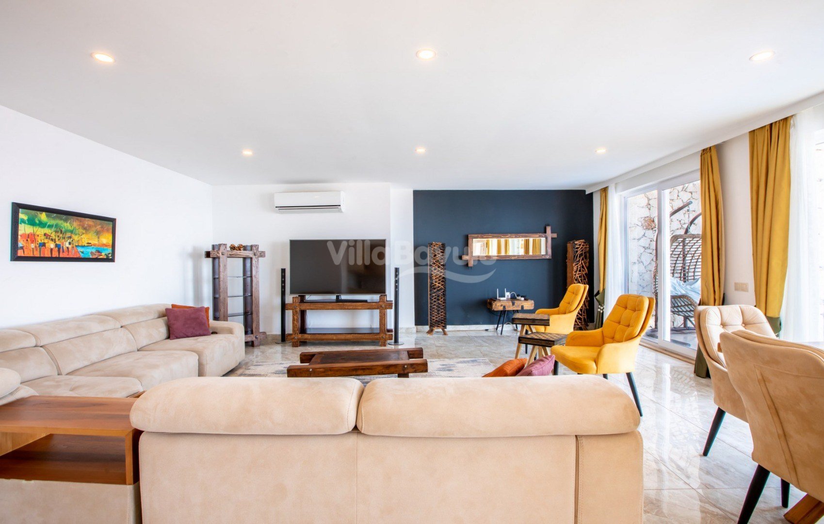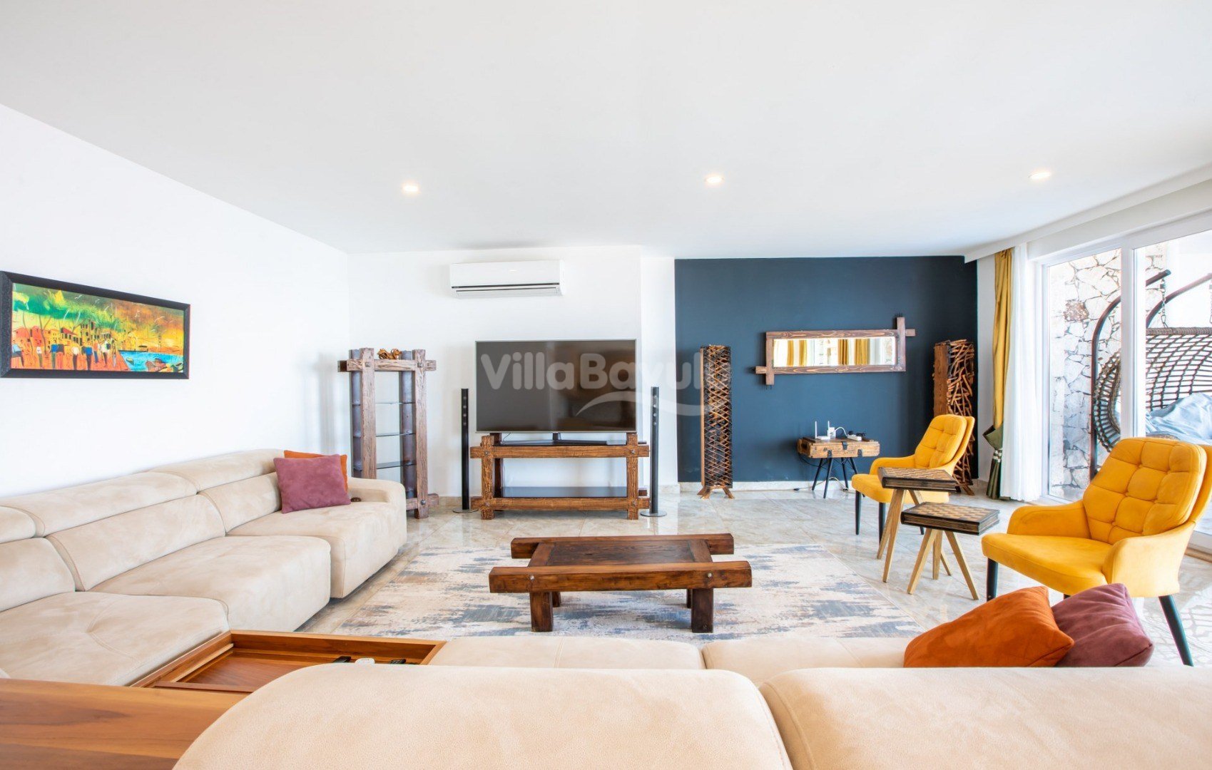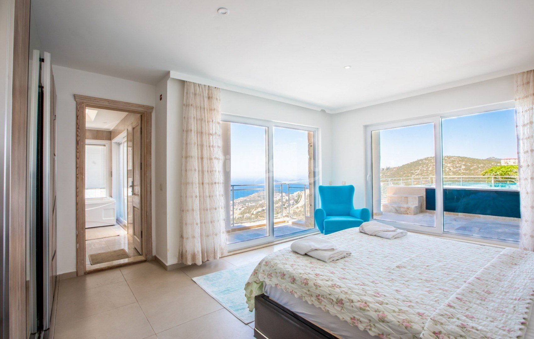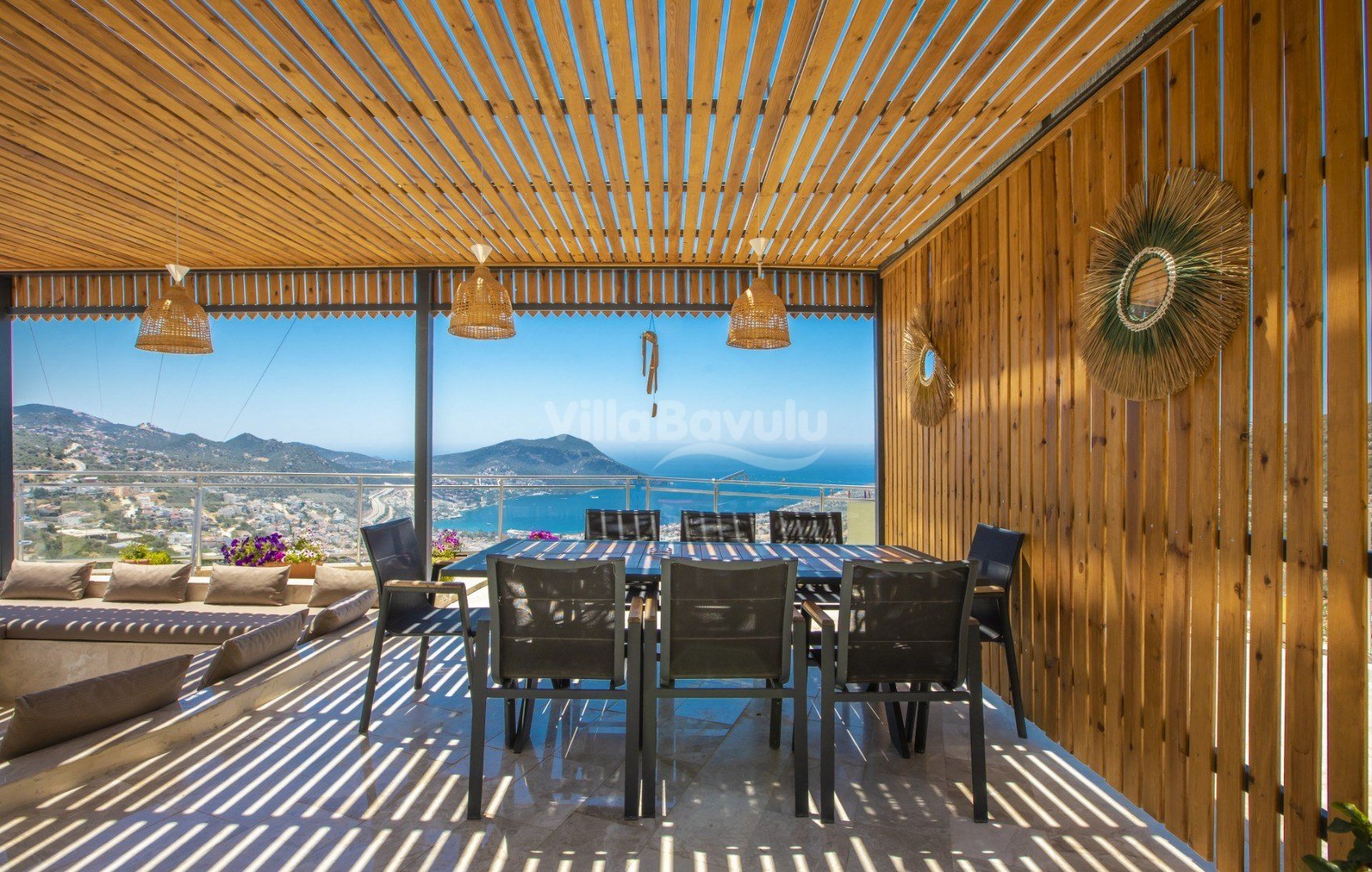 Muhteşem deniz manzarasından havuz terasına açılan görkemli alan da kapasiteye uygun şezlong takımı, oturma grubu, barbekü; salıncak, çocuk oyun alanı bulunan villanın iç mekanında ihtiyaçlarınıza karşılık verecek konforlu oturma odası, tam donanımlı açık mutfağı; Birinci ve ikinci yatak odasında çift kişilik yatak ve ebeveyn banyosu; üçüncü ve dördüncü yatak odasında ise iki adet tek kişilik yatak bulunmaktadır.
