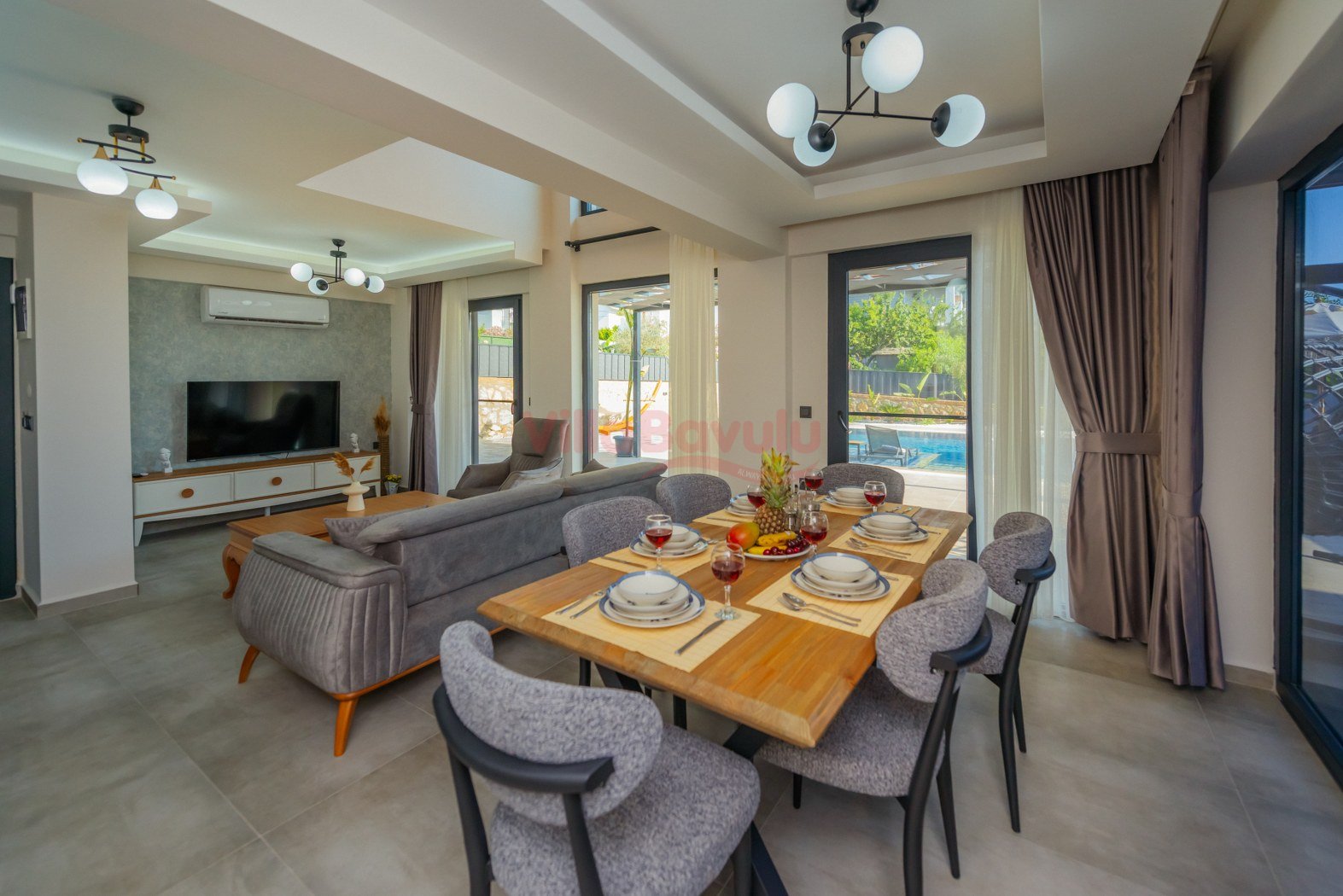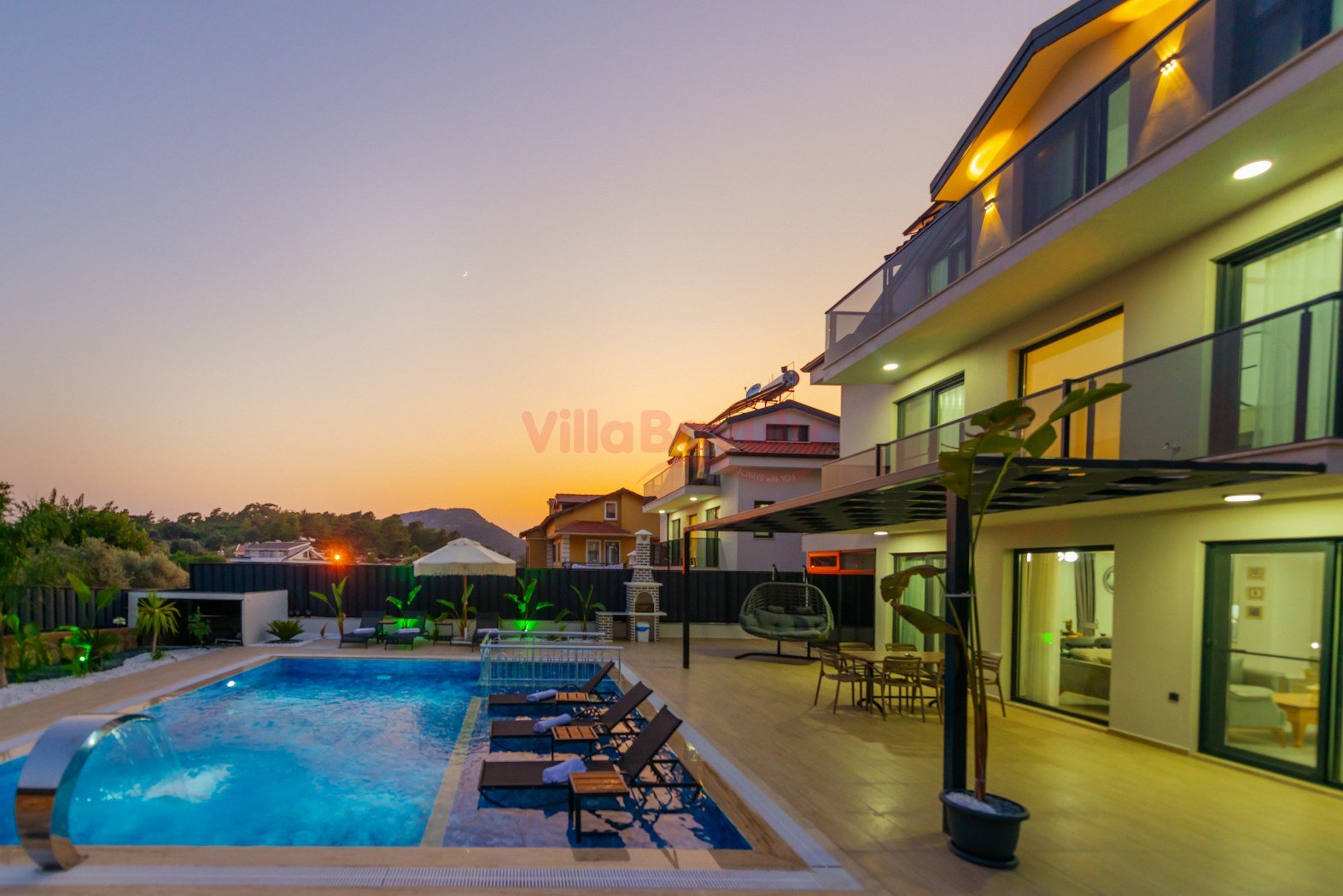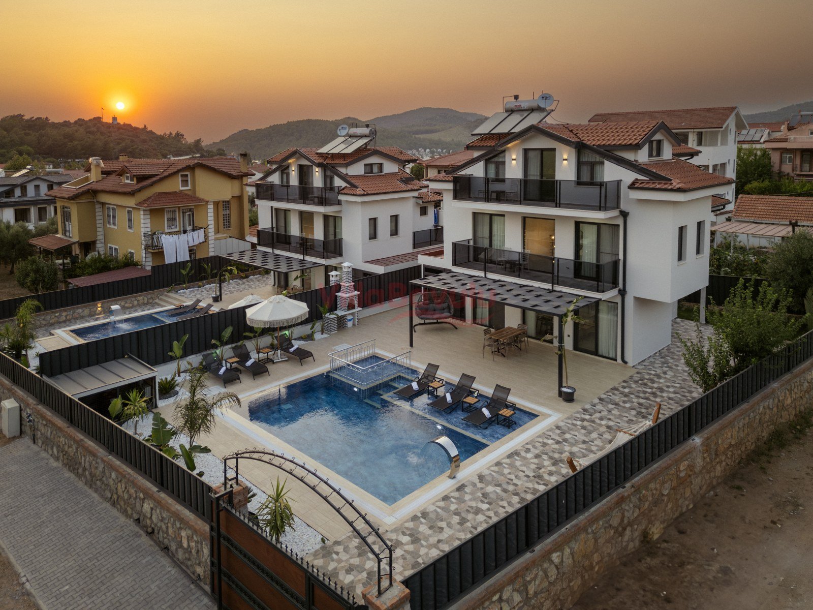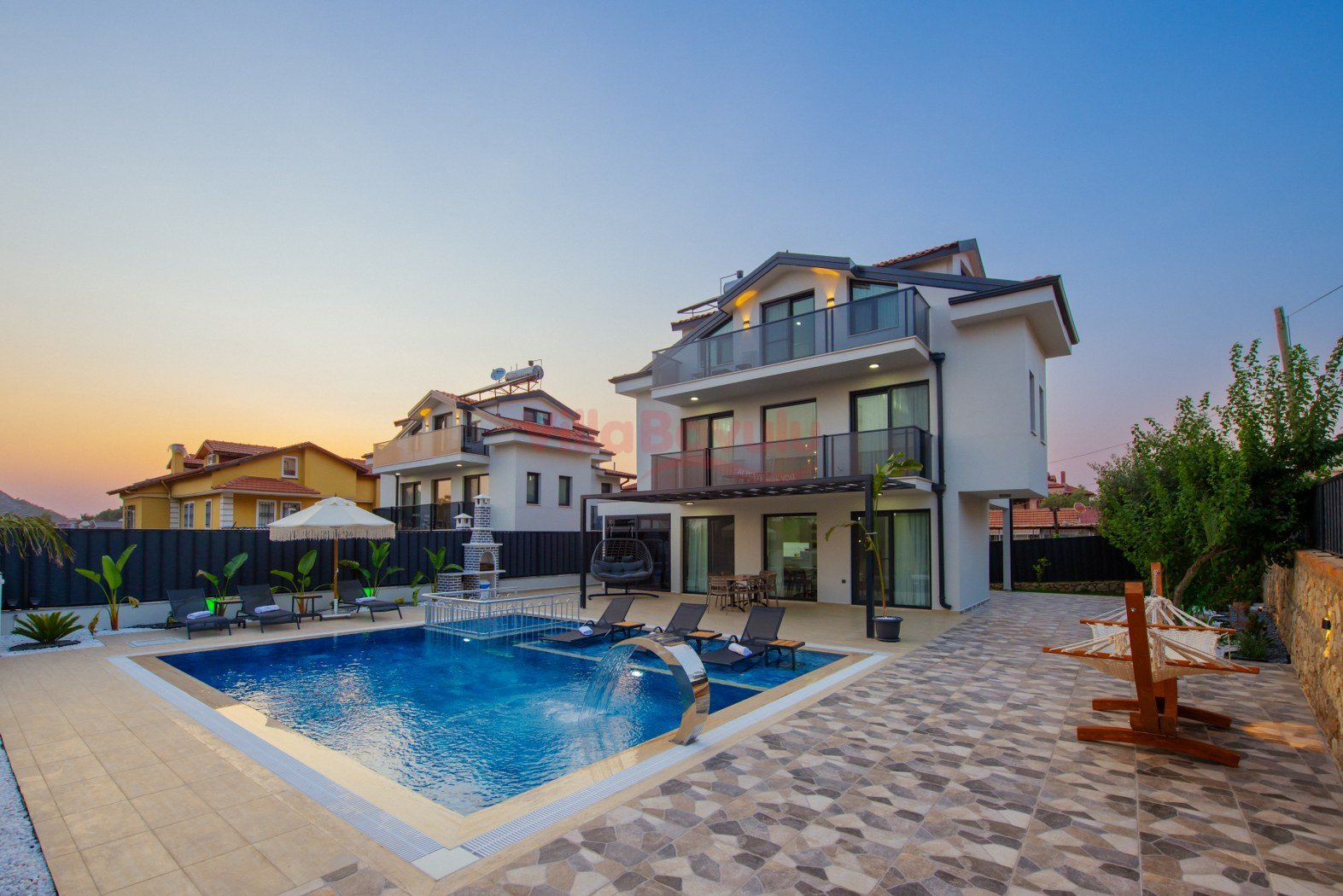 Merkezi konumu sebebiyle de popüler seçenekler arasında kendisine yer alan villamızın çocuk havuzu ve kapalı havuzu da bulunmaktadır.Genişliği ve ferahlığı ile göz dolduran villa bünyesinde kapasiteye uygun mobilyalar, ihtiyacınız olan tüm araç-gereçleri barındıran Amerikan tarzda, modern mutfak ve üç adet yatak odası mevcuttur. Konforunuz odaklı tasarlanan villanın tüm yatak odalarında klima ve özel kullanım banyo/wc bulunmaktadır. Villanın suit yatak odalarından birinde günün yorgunluğunu atmanızı ve tatilin keyfini çıkarmanızı sağlayacak bir adet jakuzisi de mevcuttur. Villanın geniş havuz terası ve müstakil bahçesinde yine kapasiteye uygun şezlong ve şemsiye, oturma alanı, salıncak, yemek masası ve barbekü alanı mevcuttur.